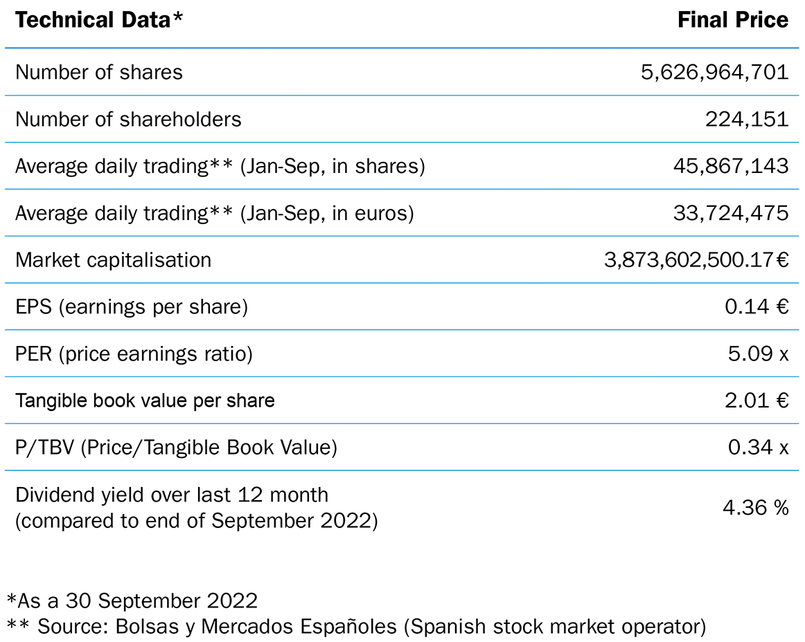 The third quarter of the year was marked by uncertainty in financial markets brought about by inflationary pressures on global economies. Fears that Germany would see its supply of Russian gas permanently cut off and worries over how that might impact economic activity in the European Union prompted central banks to take action in order to restore the stability of prices. The ECB raised its interest rate to 0.75% and left the door open to future hikes. In Spain, activity benefited from the recovery of tourism. Spain’s government extended the measures designed to deal with the consequences of the conflict in Ukraine. It is worth noting that in mid-July, the government of Spain announced a temporary bank levy. Pending legislative finalisation, at the time of the announcement it was said that the aforesaid levy would be charged at 4.8% of the core revenue (net interest income + fees and commissions) received on business in Spain by the main banks during the financial years 2022 and 2023. During the legislative process, the ECB is expected to issue a non-binding opinion regarding this levy. Similarly, at the end of the quarter, the UK government unveiled a huge package of tax cuts that caused the pound to plunge and government bond yields to soar. This prompted the Bank of England to intervene and ultimately resulted in the replacement of the Finance Minister and the reversal of the aforesaid measures. Against this backdrop, the Sabadell share was negatively impacted by the increased sensitivity of the Bank’s profit to variations in core revenue. Despite all this, year to date the share price has appreciated by +16%*. *Not including dividend distribution |
