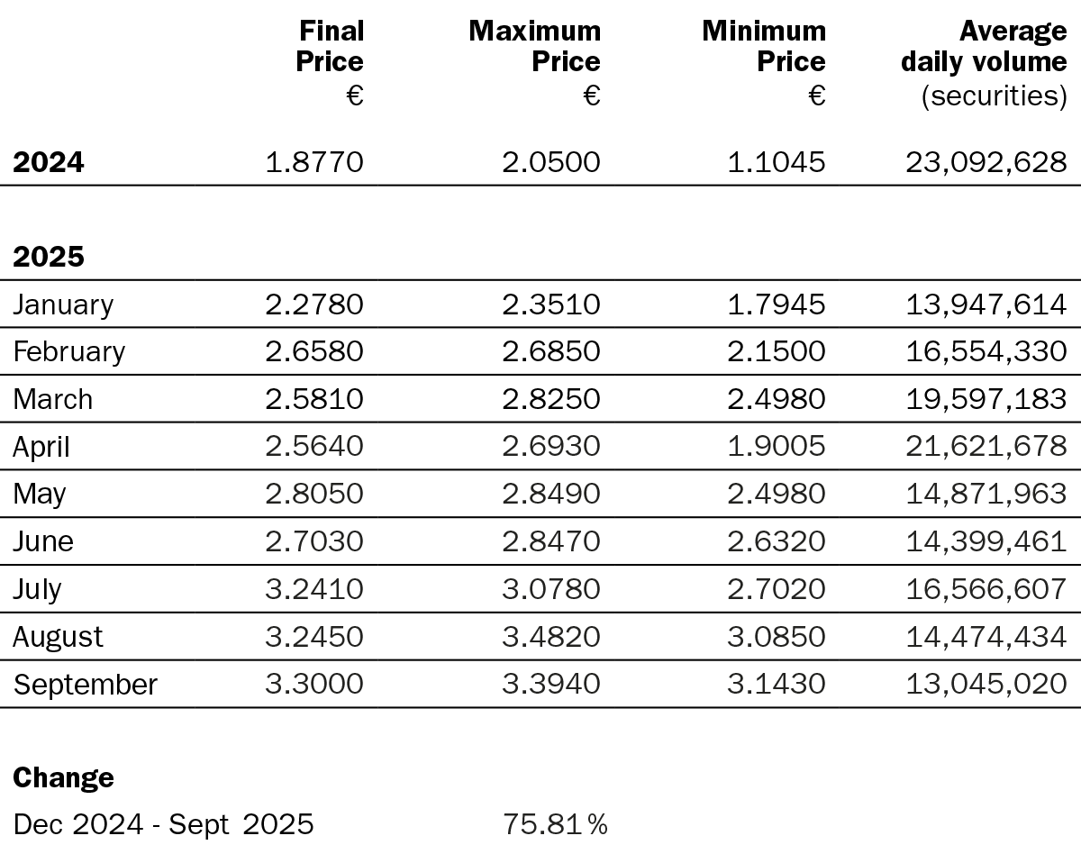 Sabadell’s stock closed September with a year-to-date revaluation of +87.8%, adjusted for dividends, in line with the average of comparable Spanish banks1 (+85.2%) and above the European banking index (+46.0%).