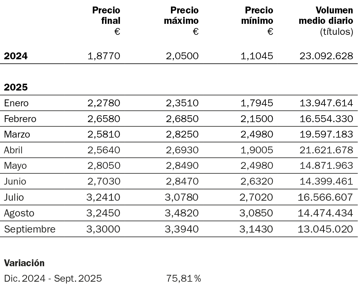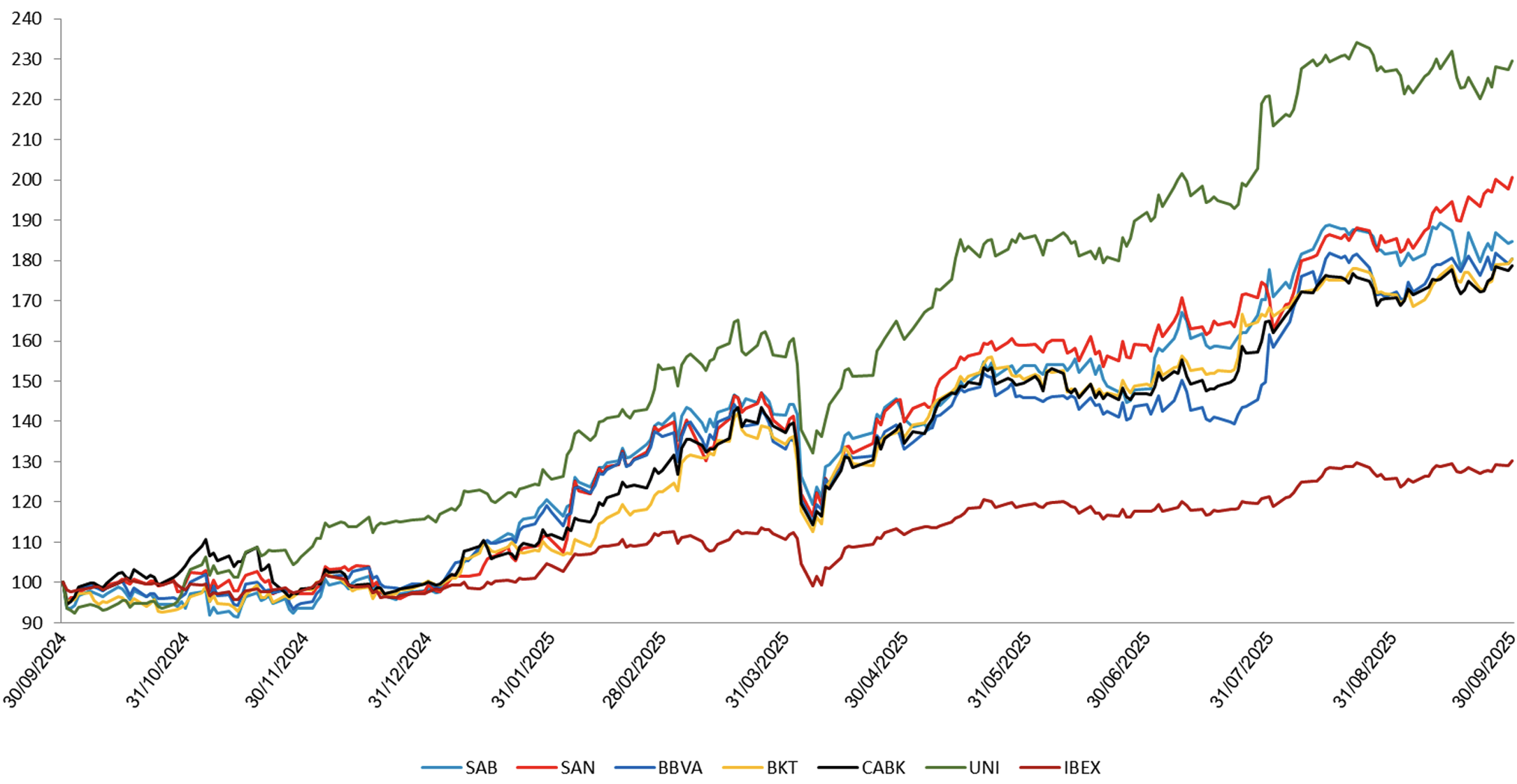 La acción de Sabadell cerró el mes de septiembre con una revalorización acumulada en lo que va de año del +87,8%, ajustada por dividendos, situándose en línea con la media de las entidades comparables españolas1 (+85,2%) y por encima del índice de bancos europeos (+46,0%).